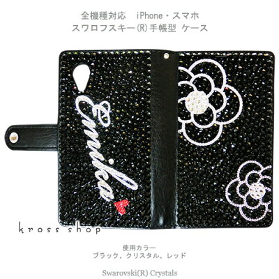 【両面デコ】らくらくスマートフォンme らくらくスマートフォン4 3 プレミアム 2 シンプルスマホ F-01L F-03K F-04J F-06F F-09E スワロフスキー 手帳型 デコ キラキラ ケース カバー デコ電 -カメリア柄&ネーム入れ(ブラックベース)-